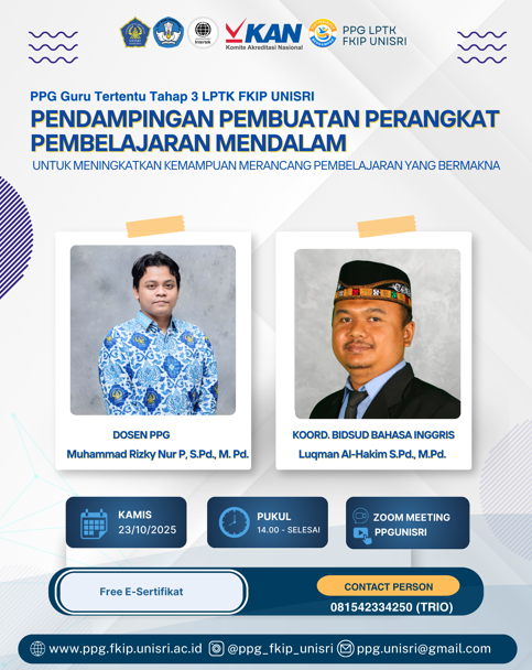 Surakarta, 23 Oktober 2025 — Program Pendidikan Profesi Guru (PPG) Lembaga Pendidikan Tenaga Kependidikan (LPTK) Fakultas Keguruan dan Ilmu Pendidikan (FKIP) Universitas Slamet Riyadi (UNISRI) menyelenggarakan kegiatan “Pendampingan Pembuatan Perangkat Pembelajaran Mendalam” bagi peserta PPG Guru Tertentu Tahap 3 Tahun 2025, yang dilaksanakan secara daring melalui Zoom Meeting, pada Kamis (23/10/2025).